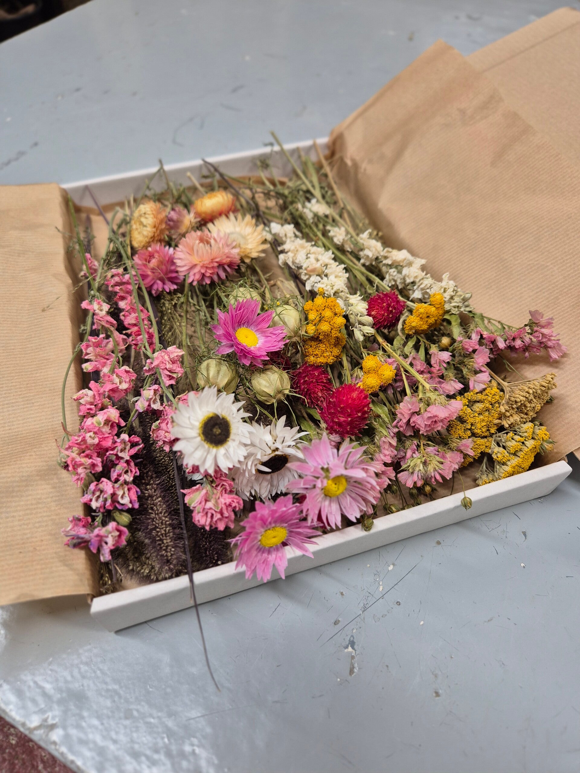 Een doosje met gevarieerde droogbloemen mét steeltjes